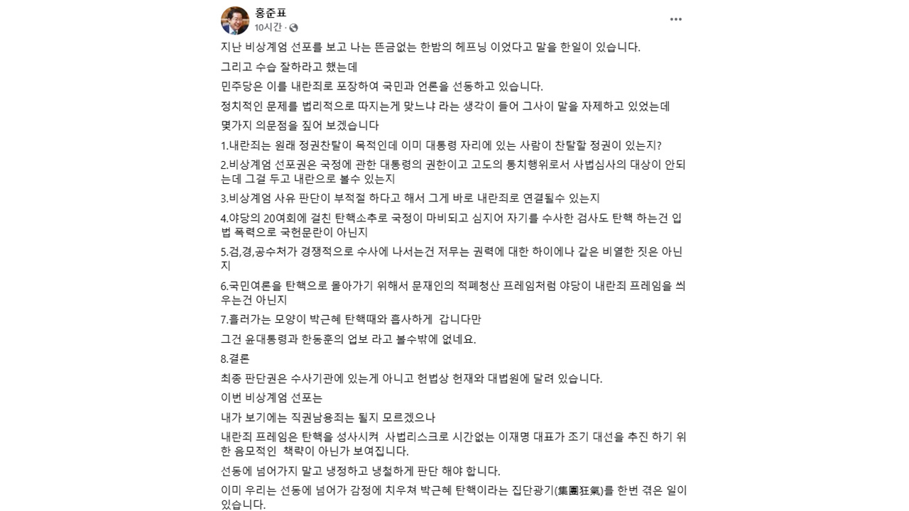 사진 출처 홍준표 대구시장 SNS윤석열 대통령 탄핵을 거듭 반대해 온 홍준표 대구시장이 비상계엄 선언을 두고 "대통령의 고도의 통치 행위로서 사법 심사 대상이 안 된다"고 주장했습니다. 홍준표 시장은 12월 11일 저녁 자신의 SNS에서 "비상계엄 사유 판단이 부적절하다고 해서 그게 바로 내란죄로 연결될 수 있는가"라...