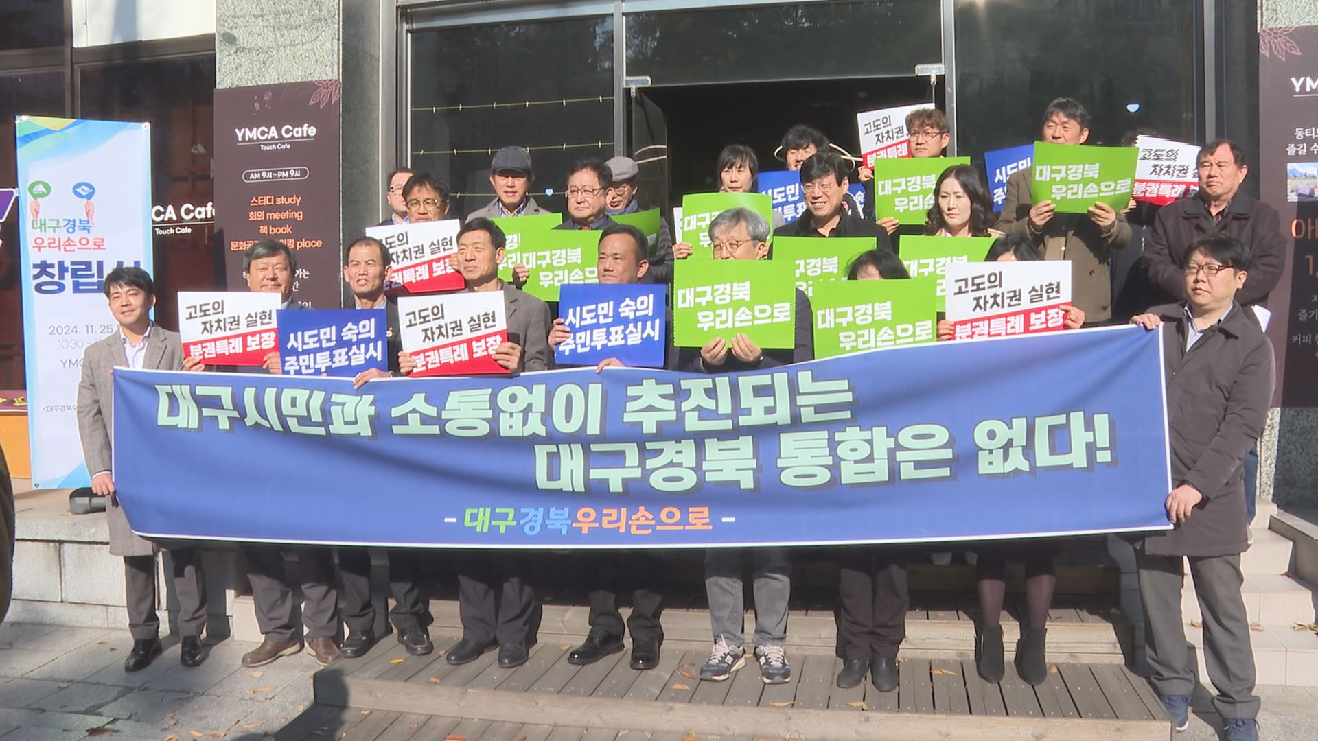 지역 12개 시민사회단체로 구성된 '대구경북우리손으로'가 발족했는데요, 지역 핵심 현안인 대구·경북 통합이 주민을 배제한 채 밀실에서 서명한 공동 합의문, 터무니없이 부풀린 기대효과 등 추진 과정이 비민주적이라고 비판하며 행정 통합을 주민 투표로 결정하자고 주장하고 있는데요.김영철 대구경북우리손으로 정책위...