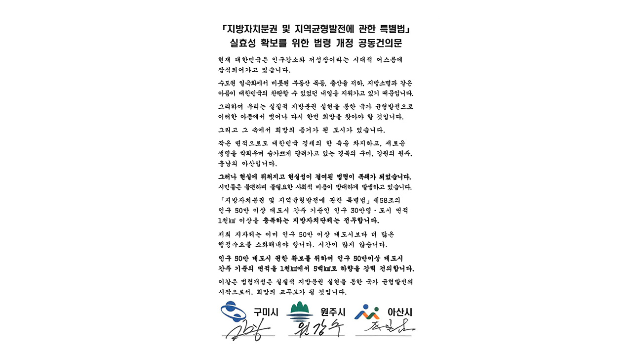 구미시·원주시·아산시 "대도시 특례 기준 면적 완화" 건의