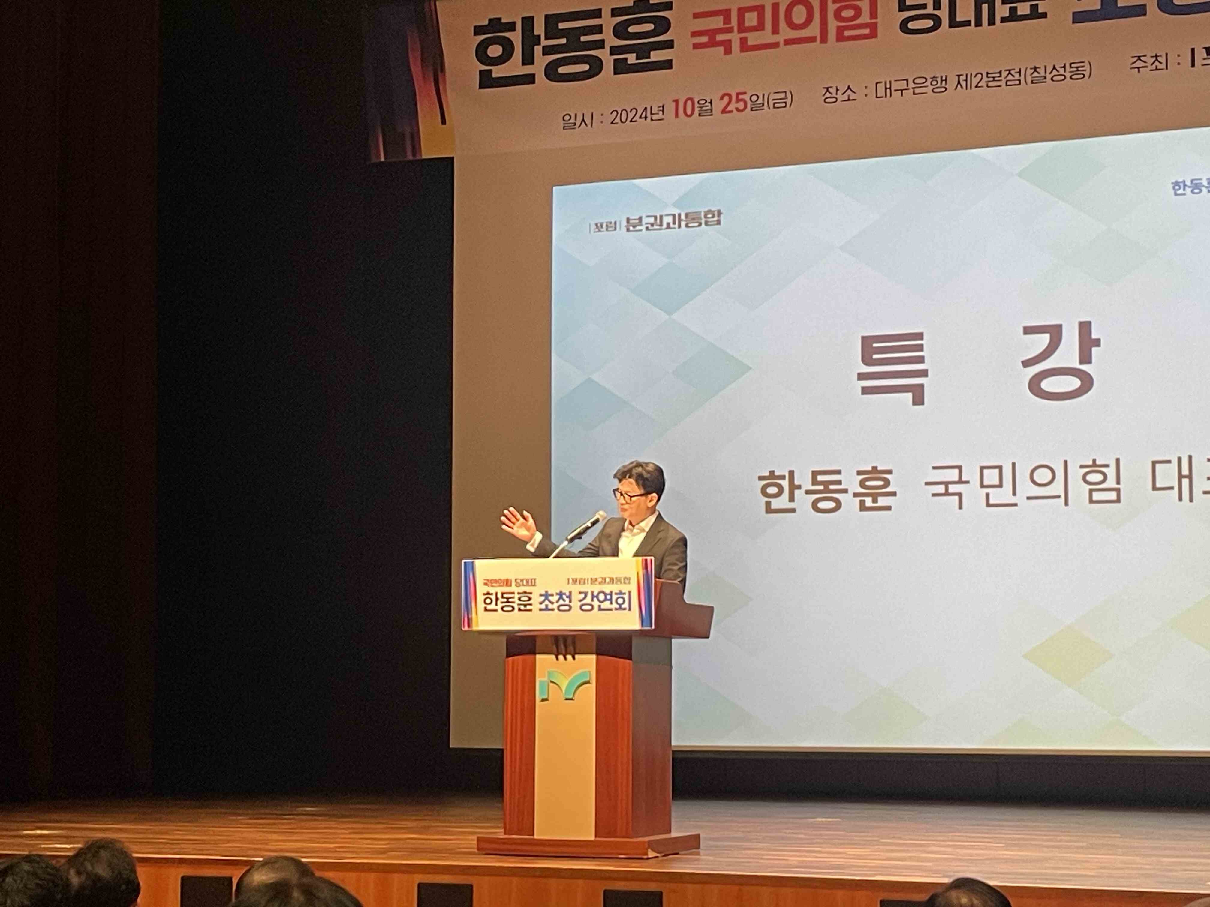 한동훈 국민의힘 대표는 10월 25일 대구에서 열린 '분권과 통합' 포럼에 강연자로 참석해 당의 변화와 쇄신을 강조했습니다.한 대표는 "11월 15일 이후 이재명 민주당 대표의 판결이 속속 나오고, 많은 상식 있는 사람들이 민주당과 이 대표에 대한 마음을 거둘 것"이라면서 "국민의힘이 받아와야 한다"고 주장했습니다. "'...