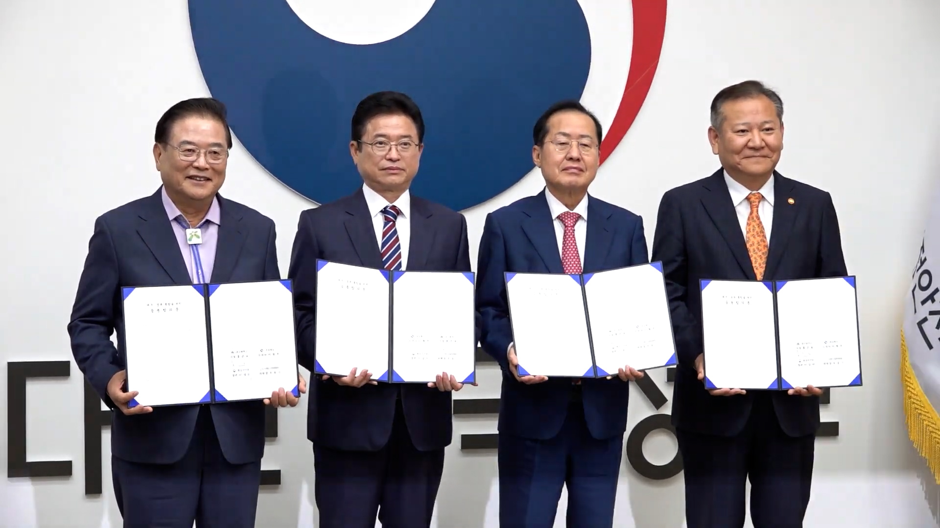 대구·경북 행정 통합이 대구시와 경북도 간 쟁점 사항에 대한 이견에 합의를 보면서 다시 속도가 붙게 됐습니다. 10월 21일 오후 2시 정부 서울청사에서 홍준표 대구시장, 이철우 경북도지사, 이상민 행안부 장관, 우동기 지방시대위원장이 모여 TK 행정 통합 합의문을 발표하고 서명했습니다. 4개 기관장이 합의문에 서명...