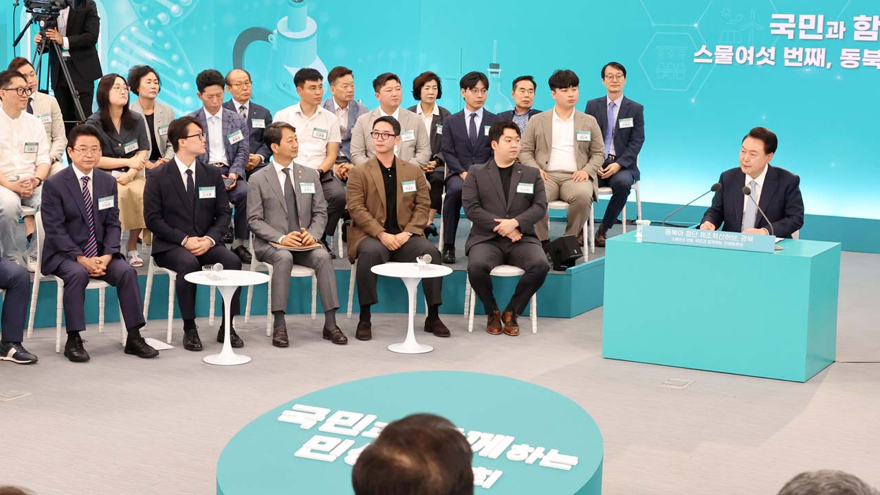 ◀앵커▶윤석열 대통령은 오늘(20일) 영남대학교에서 민생토론회를 주재하고 “영일만 횡단 고속도로를 빠르게 건설하고 국도 7호선 경주-울산 구간을 확장할 계획"이라고 발표했습니다.또 대구경북 행정통합도 중앙정부 차원에서 지원하겠다고 언급했는데요.이어 블루밸리 국가산업단지가 있는 포항으로 자리를 옮겨 기회발전...