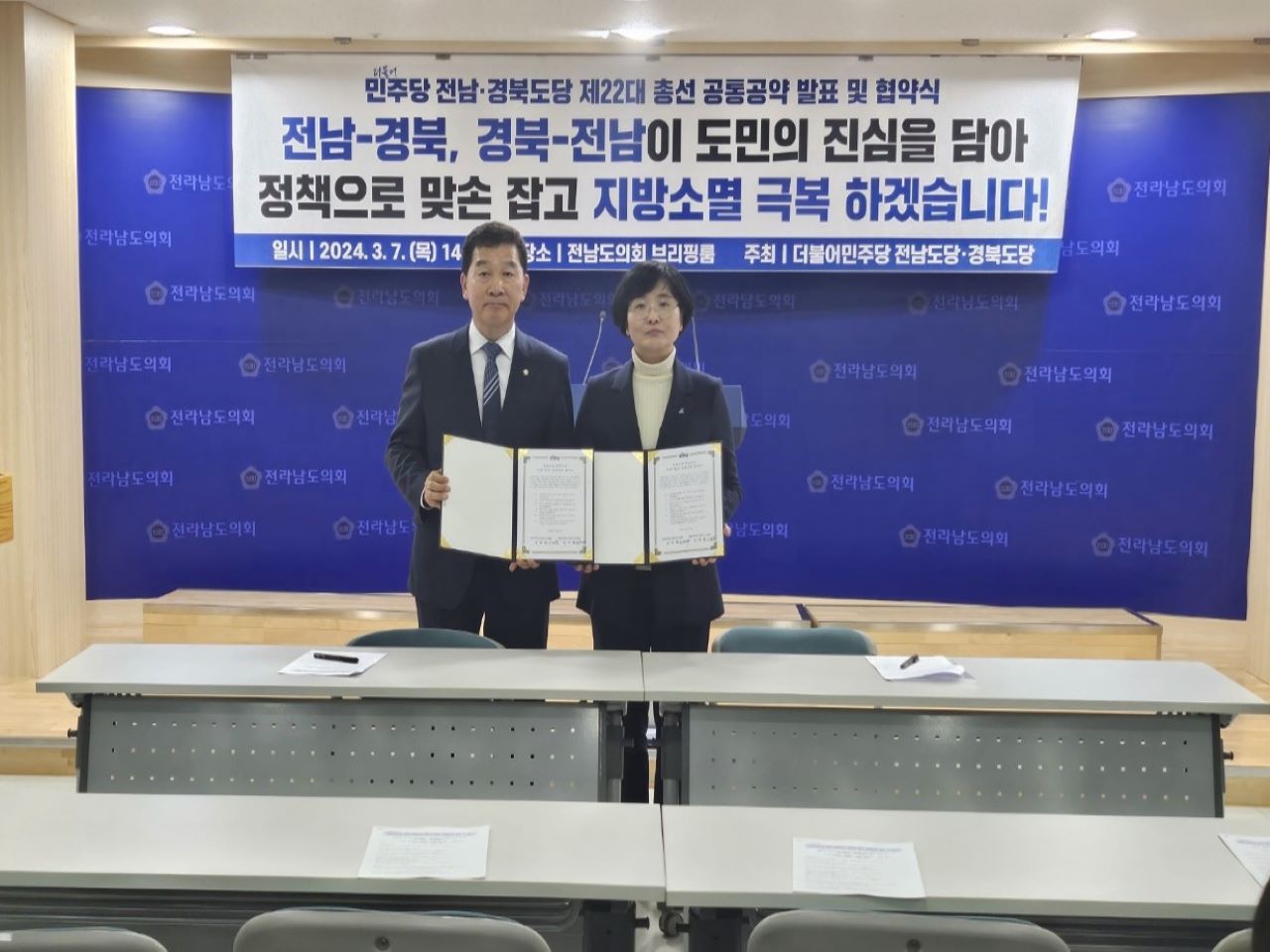 더불어민주당 경북도당과 전남도당이 제22대 국회의원 선거 승리를 위해 손을 맞잡았습니다. 민주당 경북도당, 전남도당은 3월 7일 전남도의회에서 '22대 총선 공통 공약 협약식'을 열고, 지역 소멸을 막기 위한 6개 공약을 발표했습니다. 공통 공약을 살펴보면첫째, 극심한 인구소멸 위험을 겪고 있는 면 지역 주민에게 월...