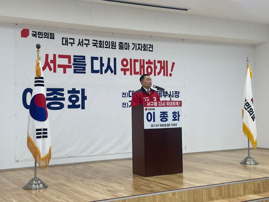 이종화 전 대구시 경제부시장이 2024년 총선에서 대구 서구에 출마하기로 공식 선언했습니다.이미 예비후보 등록을 마친 이 전 부시장은 1월 3일 국민의힘 대구시당에서 기자회견을 갖고 제22대 국회의원 선거에 대구시 서구에 출마하겠다고 발표했습니다. "기획재정부에서 28년 근무한 경제·예산 전문가"라고 자신을 소개...