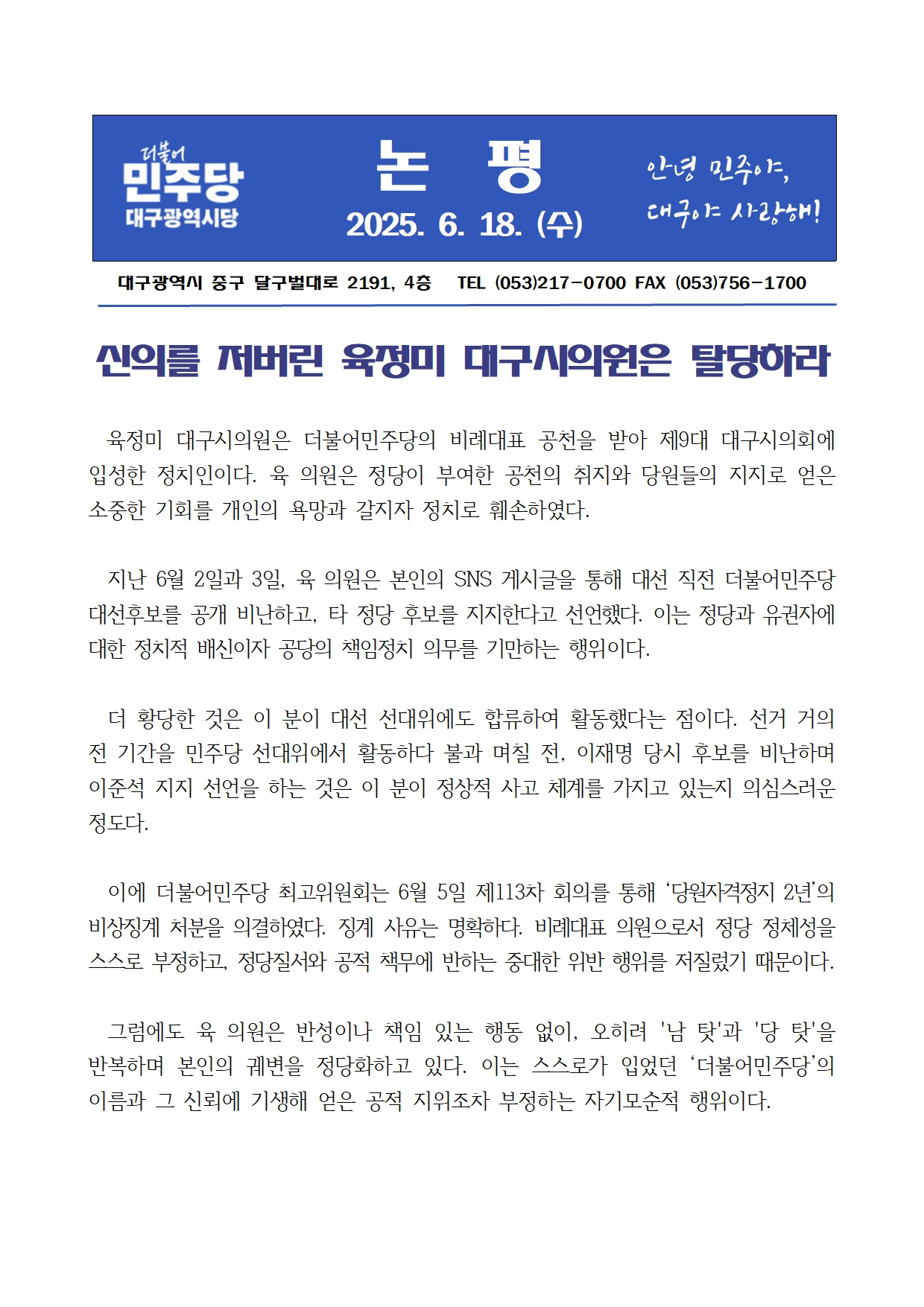 더불어민주당 대구시당은 논평을 내고 당 대선 후보를 공개 비난했던 육정미 대구시의원의 탈당을 촉구했습니다.민주당 대구시당은 "당의 비례대표 공천을 받아 시의회에 입성한 육 의원이 정당과 유권자를 정치적으로 배신하고 공당의 책임정치 의무를 기만했다"며 "지금이라도 모든 책임을 지고 스스로 탈당하라"고 요구...