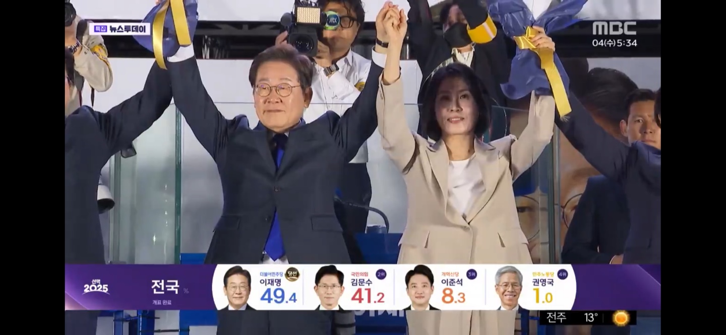 개표 막바지에 이르며 제21대 대통령 당선이 확실시되고 있는 더불어민주당 이재명 대선후보가 국회 인근 지지자들 앞에서 감사 인사와 함께 당선이 확정된 이후 구상을 밝혔습니다.민주당사 방문 이후 여의도 국회 인근 민주당 주관 행사 무대에 선 이재명 후보는 가장 먼저 "내란을 극복하고 다시는 국민을 총칼로 겁박하...
