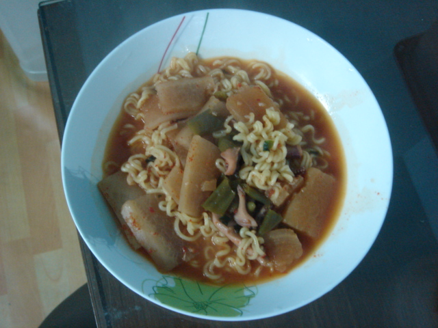 오징어 국 남은 것에 라면을 넣었지요