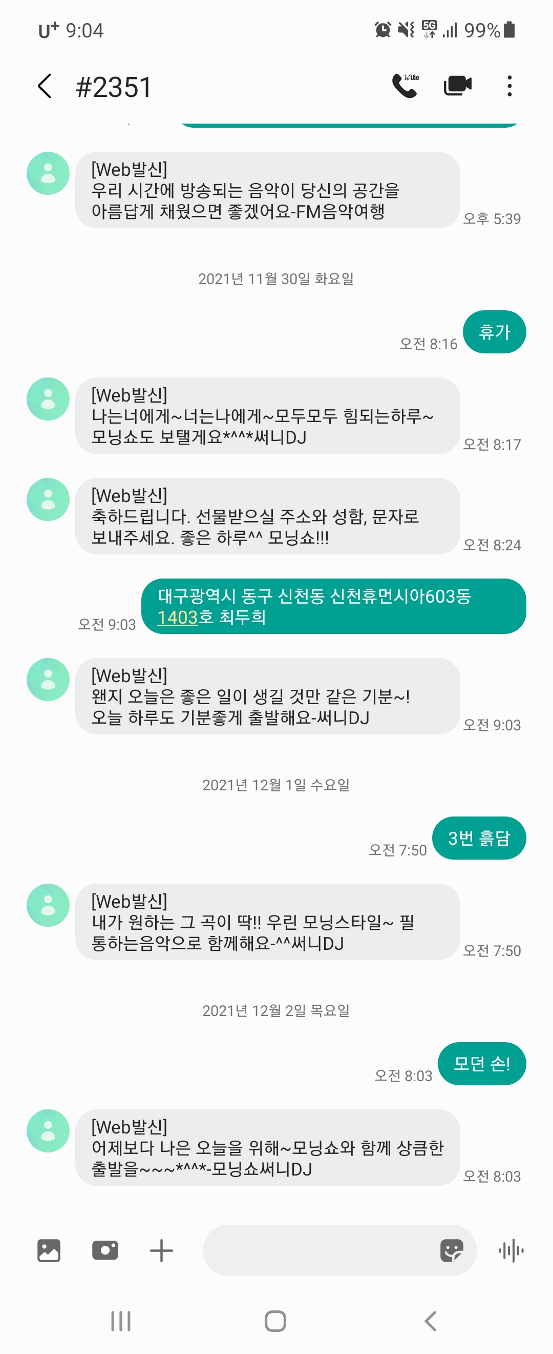 김묘선의 FM모닝쇼 김묘선의 FM모닝쇼 일 월 화 수 목 금 토 07시 00분 홈 코너소개 참여하기 제작진에게 선곡표 참여하기 11월 30일 퀴즈당첨 되었는데 아직 선물이 안와요^^;; 조회수 : 130 010 2433 4340입니다 수정 삭제 이전글 다음글 목록