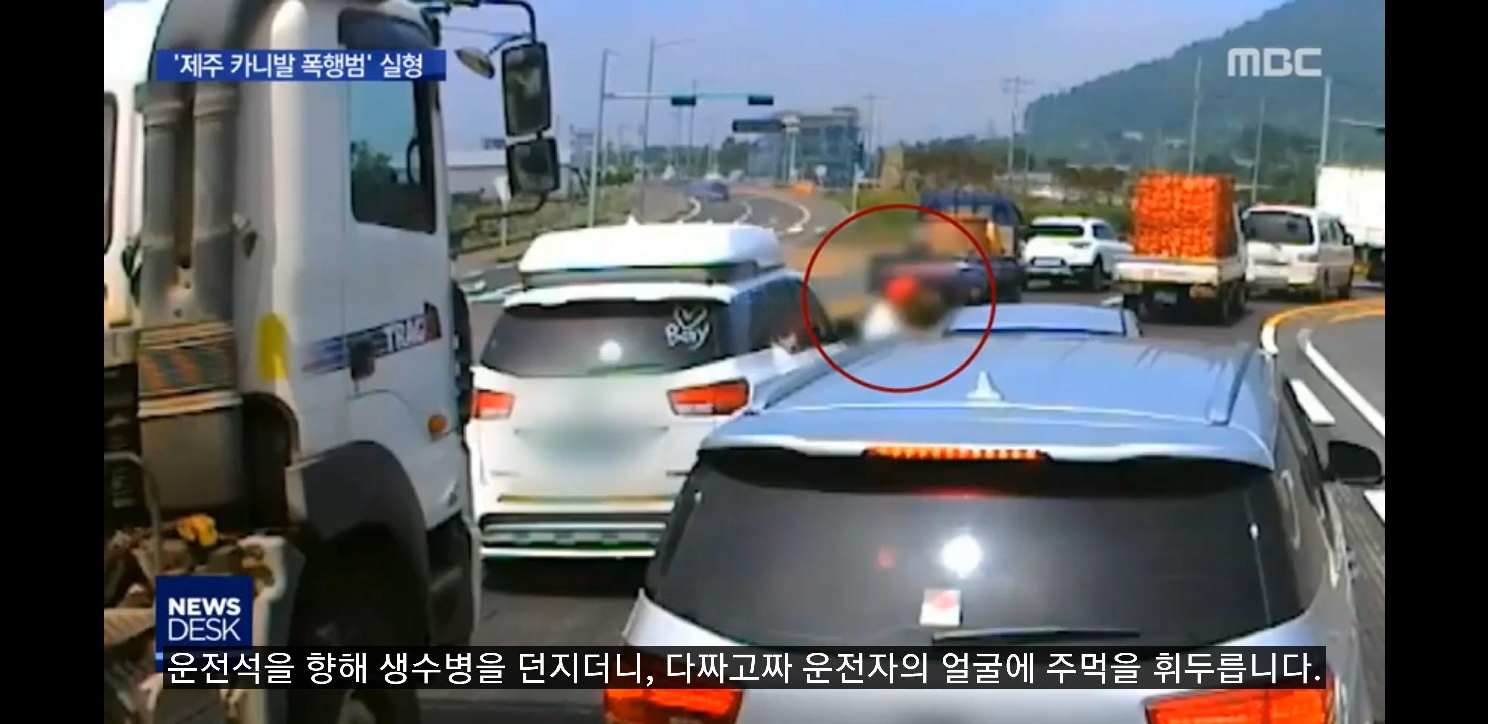 최> 네. 사건은 2019년 7월 4일 오전 10시 40분쯤 제주시 조천읍 신촌리 우회도로에서 제주시 방면 도로에서 발생했습니다. 1차선을 달리던 피해자 B씨의 아반떼 차량 앞에 A씨의 카니발 차량이 끼어들기를 했는데요. 소위 ‘칼치기’라고 하죠. 급하게 차선변경을 하자 B씨가 신호대기 시에 A씨 옆으로 다시 차선변경을 하고 차를 세워서 말싸움이 벌어지게 됩니다. 그러자 A씨가 차에서 내려서 B씨를 향해 생수병을 집어던지고 주먹을 휘둘렀으며 당시 조수석에서 촬영을 하고 있던 B씨의 아내 핸드폰을 땅바닥에 집어던지고 차선 밖으로 집어던지기도 했습니다.