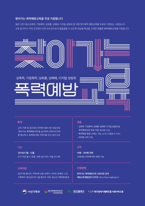 대구시 행복 진흥사회서비스원은 대구 시민을 대상으로 '2024년 찾아가는 폭력 예방 교육'을 실시합니다.젠더 폭력에 대한 지역 사회의 인식을 개선하고 폭력 예방 확산을 위해 법적 의무 교육 대상 기관을 제외한 일반 시민 또는 희망 단체를 대상으로 진행합니다.교육 우선 대상은 폭력 예방 교육 사각지대에 해당하는 소...