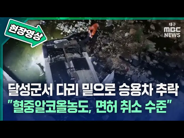 6월 26일 밤 11시 50분쯤 대구 달성군 현풍읍을 달리던 승용차 한 대가 난간을 들이받고 다리 밑으로 떨어졌습니다.이 사고로 운전자 40대 남성이 다쳐 병원으로 옮겨졌습니다.경찰 조사 결과, 이 남성은 사고 당시 혈중알코올농도 면허 취소 수준이었던 것으로 드러났습니다.경찰은 CCTV 등을 토대로 자세한 사고 경위를 ...