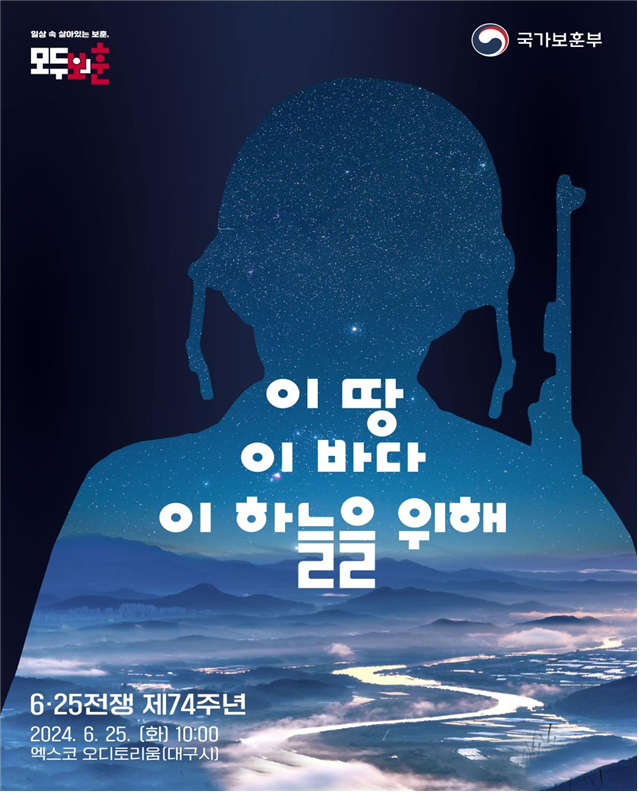 6·25전쟁 제74주년 정부 행사가 6월 25일 오전 10시 대구 엑스코 오디토리움에서 열립니다.'이 땅, 이 바다, 이 하늘을 위해'라는 주제로 열리는 이번 행사에는 참전유공자와 정부, 군 주요 인사 등 천3백여 명이 참석할 예정입니다.매년 서울에서 열리던 6·25전쟁 정부 행사가 지방에서 열리는 건 이번이 처음입니다.국가...