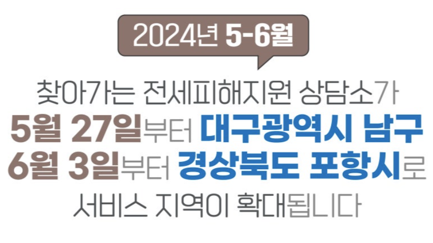사진 제공 주택도시보증공사국토교통부와 주택도시보증공사(HUG)가 대구 남구와 경북 포항에서 '찾아가는 전세 피해 지원상담소'를 운영합니다. 5월 27일부터 오는 31일까지는 대구 남구청에서, 6월 3일부터 7일까지는 포항 남구청에서 상담소를 운영합니다.찾아가는 상담 서비스는 전세 사기 피해자에게 법률과 심리, 금융...