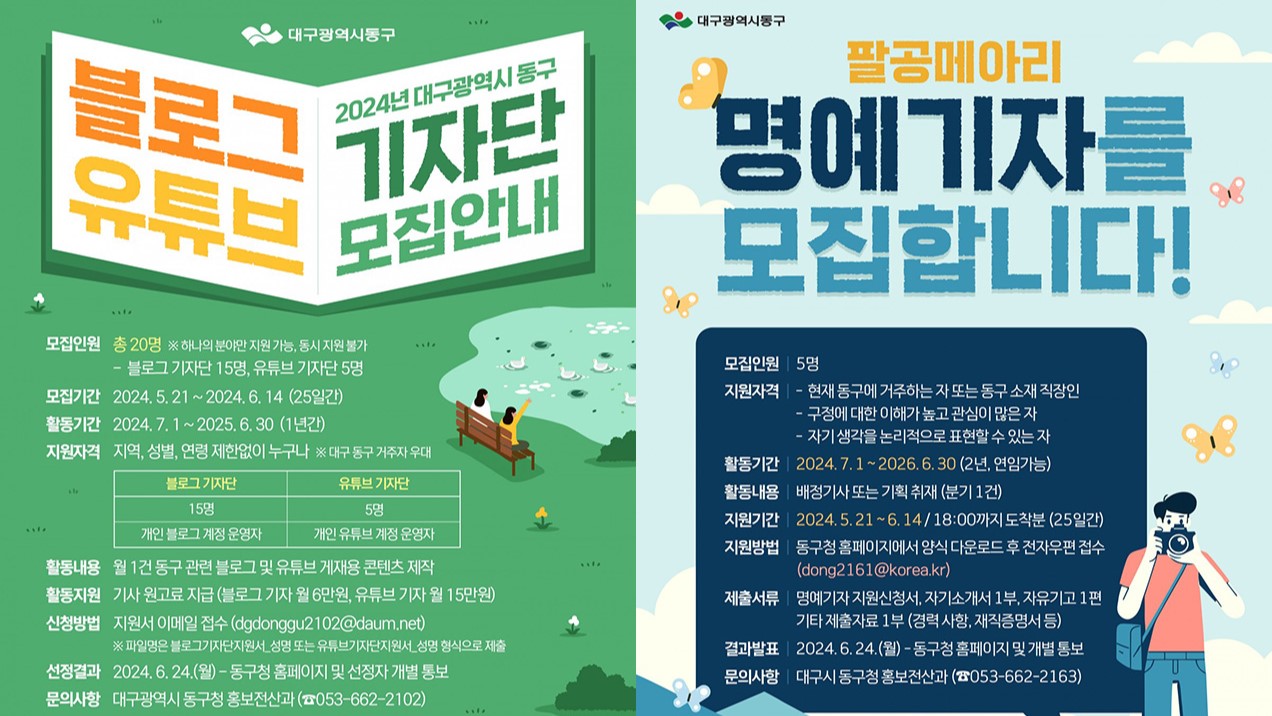 대구 동구, 소식지·블로그·유튜브 기자단 모집