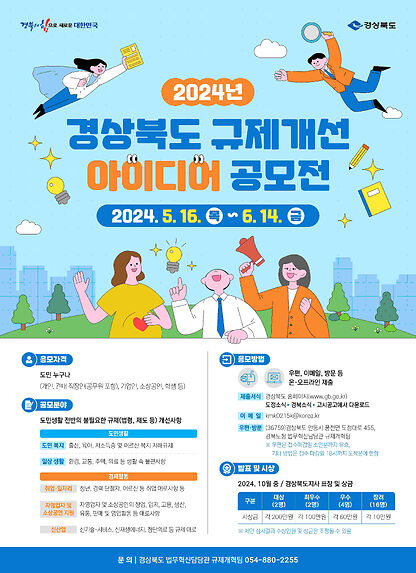 경상북도는 불필요한 규제와 걸림돌이 되는 규제를 개선하기 위해 '2024 경상북도 규제 개선 아이디어'를 공모합니다.공모 분야는 출산, 육아, 저소득층, 장애인 등 복지 분야, 교통, 주택, 의료 등 일상생활 분야, 청년, 어르신 일자리 분야 등 5개 분야입니다.이번 공모는 6월 14일까지 한 달간 진행되며 규제개혁위원회 ...