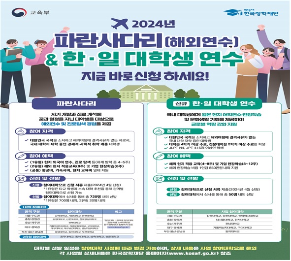 한국장학재단은 학생들에게 해외연수 기회를 제공하는 '한 일 대학생 연수'와 '파란 사다리' 사업 참여 대학 명단을 발표했습니다.한 일 대학생 연수 사업에 선정된 대학은 구미대, 가톨릭상지대, 남서울대 등 10곳입니다. 파란 사다리 사업 중 한 달 단기 해외 연수에 선정된 대학은 계명문화대, 구미대, 대구대, 대구보건...