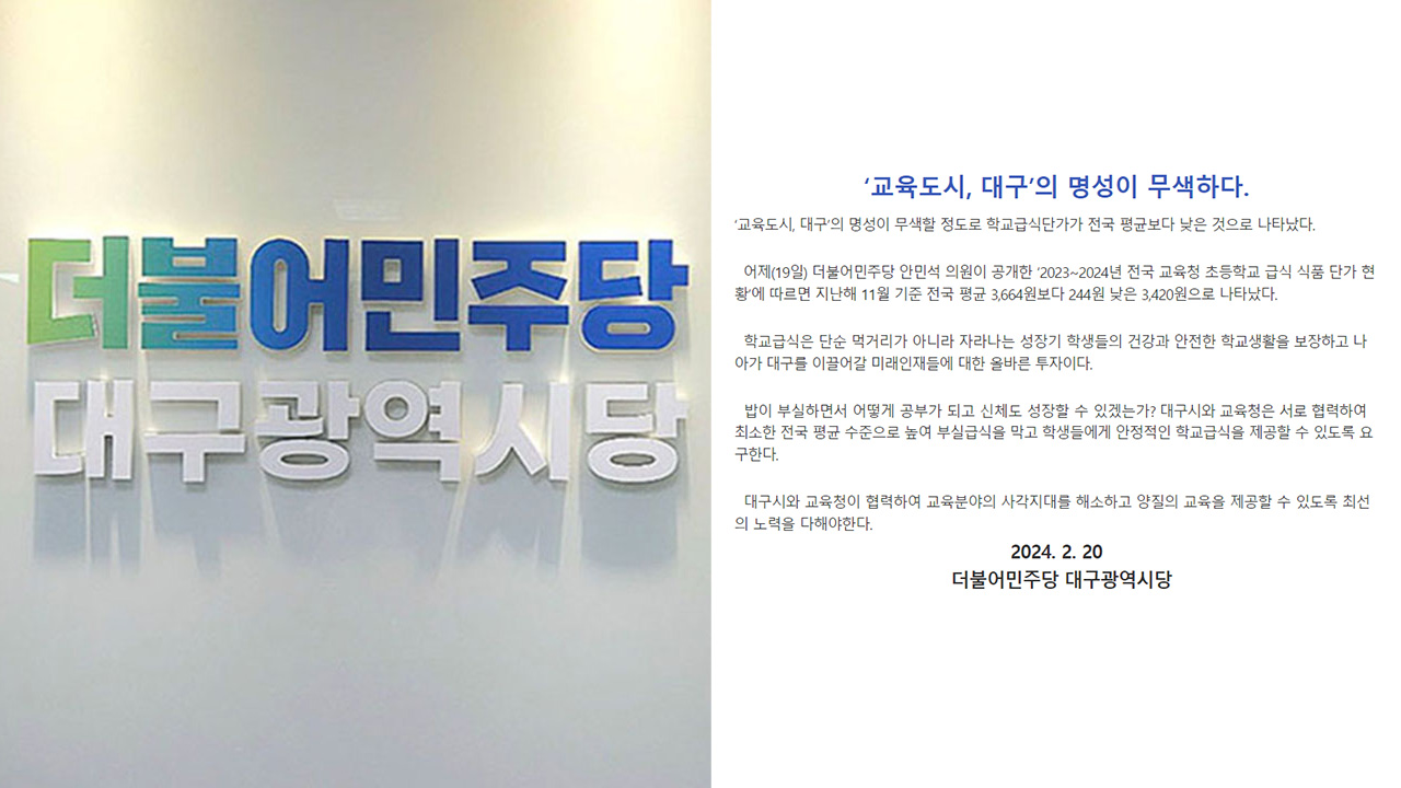 (우) 사진 출처 더불어민주당 대구광역시당더불어민주당 대구시당은 "대구의 학교 급식 식품 단가가 전국 평균보다 낮은 것으로 나타나 '교육도시 대구'라는 명성이 무색하다"고 지적했습니다."민주당 안민석 의원이 공개한 자료에 따르면 2023년 11월 조사 기준, 대구의 2024년 학교 급식 식품 단가는 3,420원으로 전국 평...