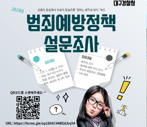 대구경찰청과 대구시자치경찰위원회가 지역에 맞는 치안 활동을 하기 위해 범죄 예방 정책에 대한 설문조사를 합니다.대구 시민에게 각자 살고 있는 지역에서 범죄에 대한 어떤 불안감을 느끼는지, 희망하는 경찰 활동은 뭔지 등을 묻습니다.기간은 1월 22일부터 2월 7일까지입니다.대구경찰청 홈페이지에서 설문조사 링크...