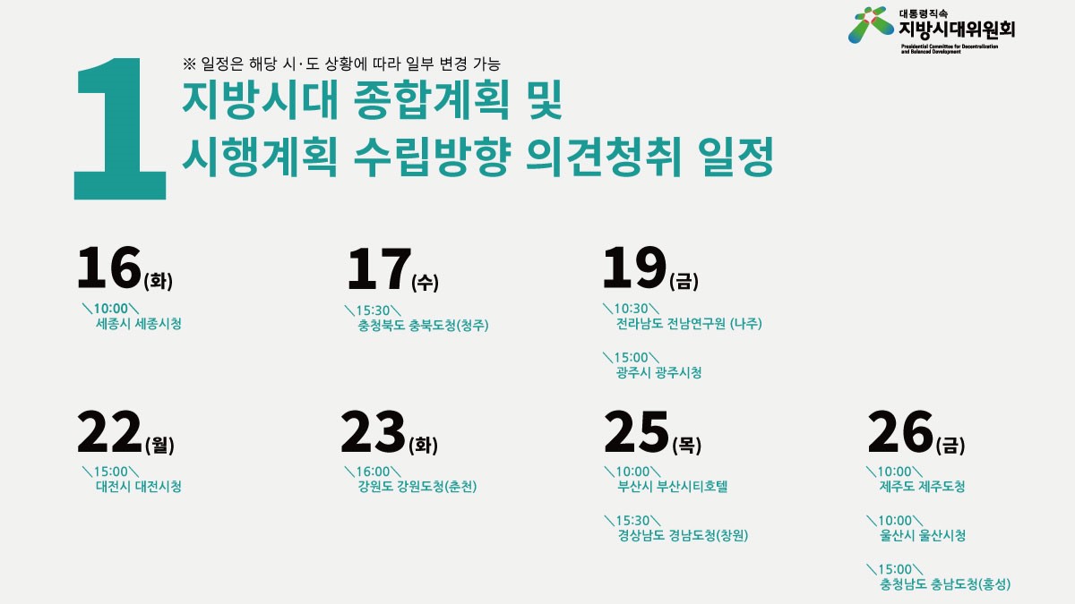 사진 출처 지방시대위원회대통령 직속 지방시대위원회는 '제1차 지방시대 종합계획'과 '2024년 지방시대 시행계획 수립 방향'에 대한 시도민 의견 청취를 1월 29일 대구 시청에서, 30일에는 경북도청에서 합니다. 시도별 의견 청취는 지방의 다양한 수요를 지방 시대 시행계획에 담아내고 주민들도 시행계획에 참여하도록 ...