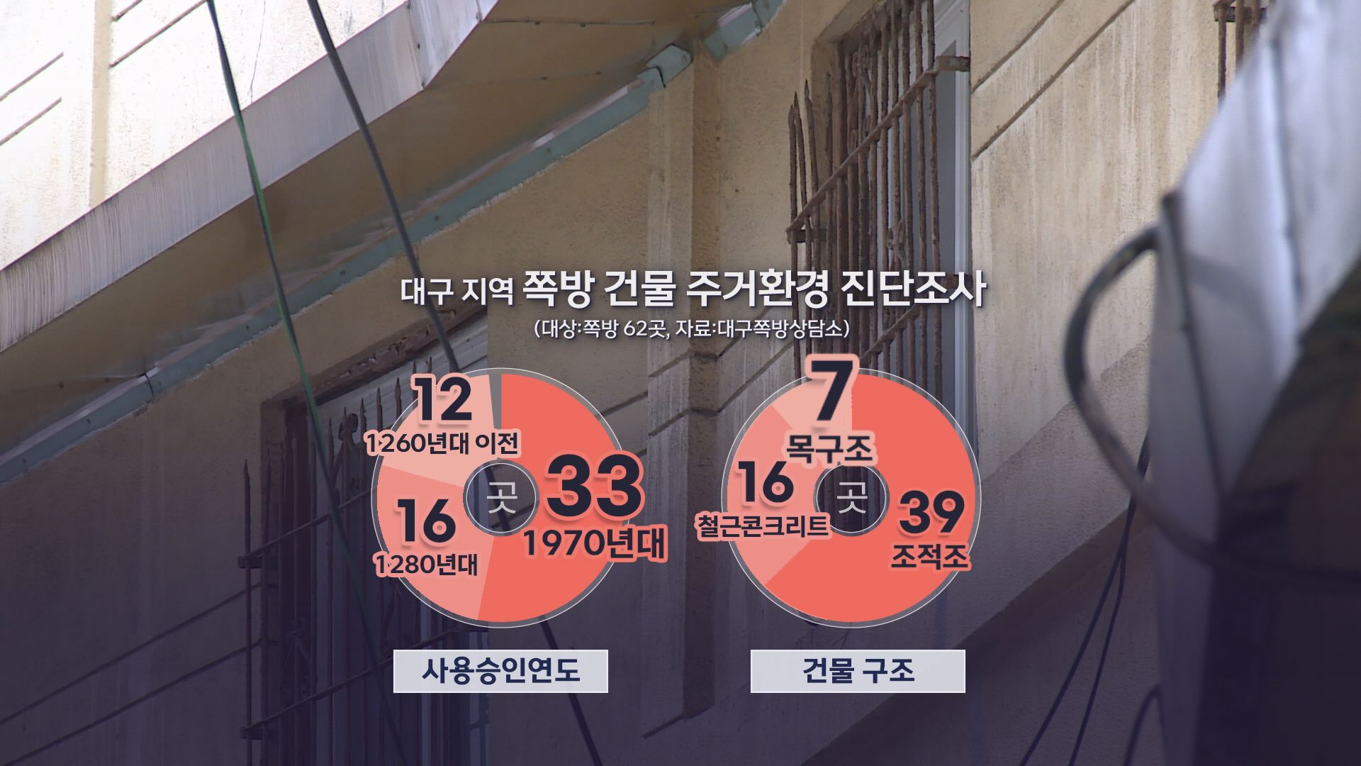 대구 '첫' 쪽방 건물 구조 진단대구 쪽방 상담소가 학계와 함께 지역의 쪽방 건물을 구조적으로 진단하고 구체적인 거주 환경을 데이터로 모으는 작업에 나섰습니다.대구에서 이런 식의 쪽방 실태조사는 처음입니다.매년 폭염과 혹한기를 앞두고 일시적인 냉난방 용품 지원만 반복되는 상황을 바꿔보려는 시도입니다.문제적...
