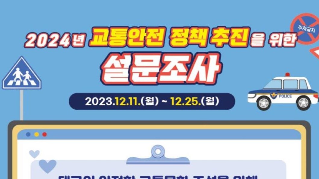 사진 제공 대구경찰청대구경찰청이 12월 11일부터 시민들에게 필요한 교통안전 정책을 묻는 설문조사를 합니다.12월 25일까지 대구 경찰 홈페이지나 SNS 채널 등을 통해 대구시민 누구나 참여할 수 있고, 참여자에게는 추첨을 통해 에어팟, 텀블러, 커피 교환권 등 선물을 줍니다.대구시와 도로교통공단, 한국교통안전공단...