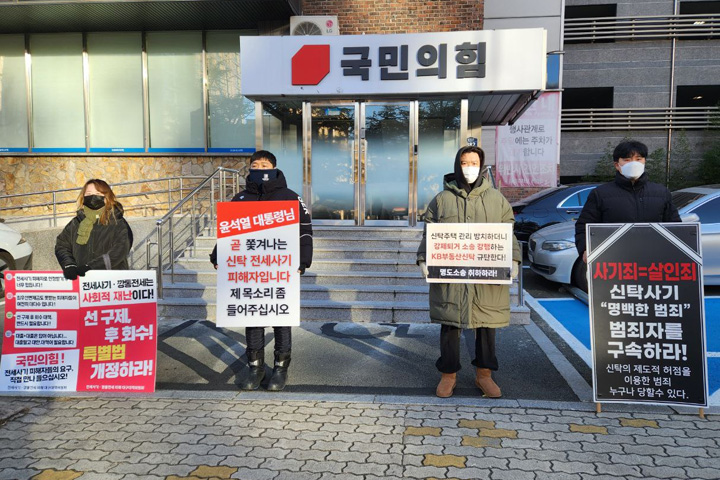 전세 사기·깡통전세 피해 대구 대책위원회는 11월 30일부터 정기국회가 끝나는 12월 8일까지 국민의힘 대구시당 앞에서 릴레이 1인 시위를 벌입니다."생색내기 대책만 남발하는 윤석열 대통령, 원희룡 국토부 장관, 김기현 당 대표를 규탄한다"라며 피해자 현실을 반영한 특별법의 개정과 대책 마련을 촉구하고 있습니다. ...