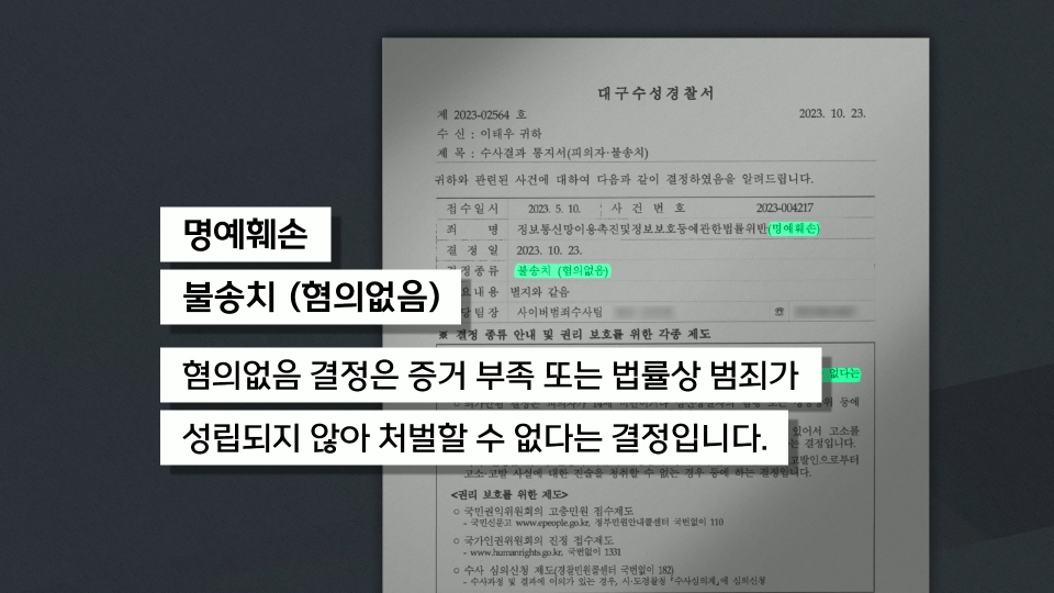 대구수성경찰서가 판단한 혐의 없음·각하대구수성경찰서는 대구시가 대구문화방송 시사톡톡 관계자 4명을 상대로 낸 명예훼손 고소 사건에 혐의 없음과 각하 결정을 내렸습니다.혐의 없음 결정은 '증거 부족 또는 법률상 범죄가 성립되지 않아 처벌할 수 없다는 결정'입니다. 고소당한 사람은 4명인데, 우선 기자 2명은 혐...
