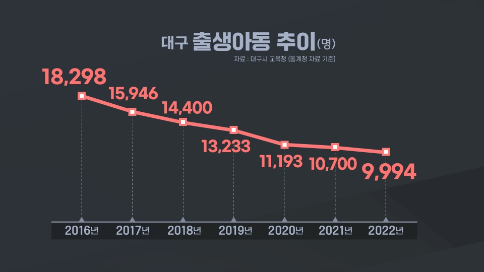 신생아 수, 만 명 선 무너져저출생 고령화는 시급한 화두라는 말로는 부족하다 할만한 상황입니다.2022년 대구의 신생아 수가 만 명 선이 무너졌는데요, 2022년 대구에서 태어난 신생아 수는 9,994명, 불과 7년 만에 절반 가까이 줄었습니다.2016년 대구의 신생아 수는 18,298명, 2017년 15,946명, 2018년 14,400명이던 것...