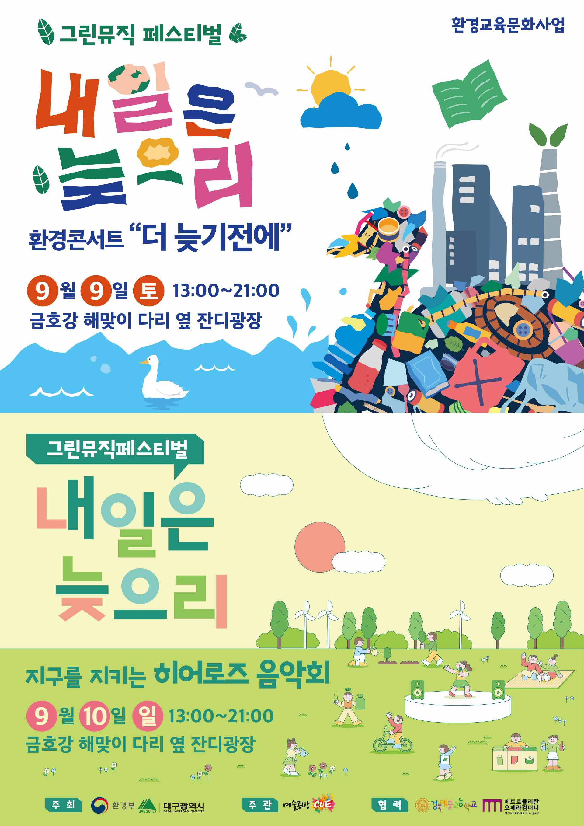 환경부가 주최하는 '2023 환경 교육 문화 사업'의 하나로 그린 뮤직 페스티벌 '내일은 늦으리'가 9월 9일부터 10일까지 이틀 동안 대구 동촌 해맞이 다리 옆 잔디광장에서 펼쳐집니다.토요일 주 무대에서는 환경 동요 대회와 환경 콘서트가 열리고, 환경 교육 체험 공간에서는 화분 만들기, 목공 체험, 자전거 발전기 에너...