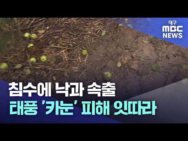 ◀앵커▶제6호 태풍 '카눈'이 경북을 지나 수도권으로 북상하면서 비바람은 거의 잦아들었습니다.경북에 다행히 인명 피해는 없었지만, 도로와 주택 침수, 낙석 등 400여 건의 크고 작은 소방 신고가 접수됐습니다.특히 강한 비바람이 몰아쳤던 청송과 문경, 영주에는 과수 낙과 피해가 속출했습니다.김서현 기자가 보도합니...