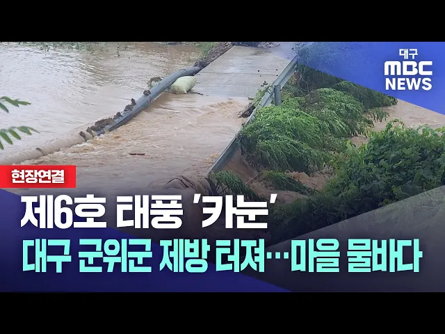 ◀앵커▶한반도를 관통한 제6호 태풍 '카눈' 소식 집중 전해드립니다. 이번 태풍으로 2023년 7월 대구로 편입된 군위군에서는 제방이 무너졌습니다.마을 전체가 물에 잠겨 119 구조대원들이 보트를 타고 고립된 주민 구조에 나섰습니다.대구에서는 군위에서 1명이 숨지고, 달성군에서 1명이 실종되는 등 인명 피해가 발생했는...