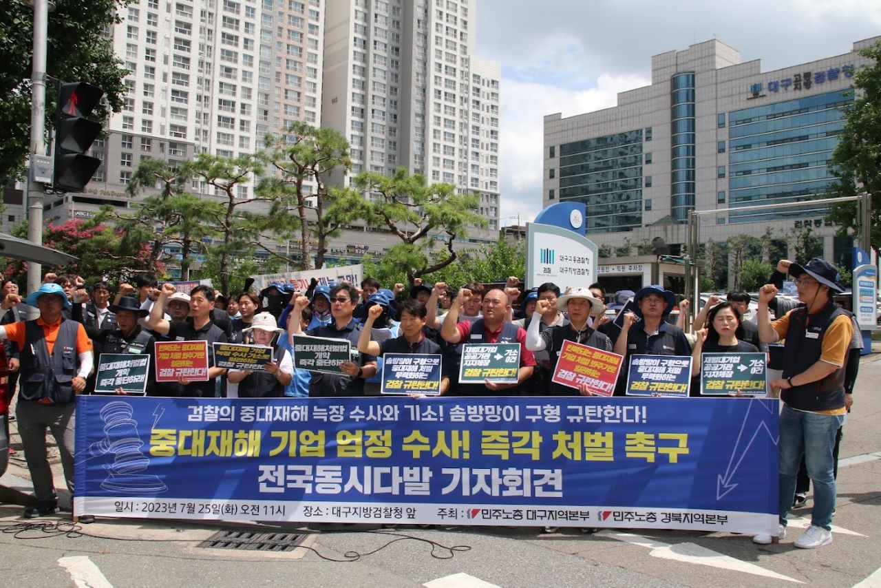 민주노총 대구·경북지역본부는 7월 25일 대구지검 앞에서 기자회견을 열고 검찰이 중대재해 기업에 대해 늑장 수사와 기소, 솜방망이 구형으로 일관하고 있다며 규탄했습니다.중대재해처벌법이 시행된 2022부터 대구·경북에서 중대재해처벌법이 적용된 사고는 모두 35건인데, 기소 의견으로 검찰에 송치된 사건은 8건이고 ...