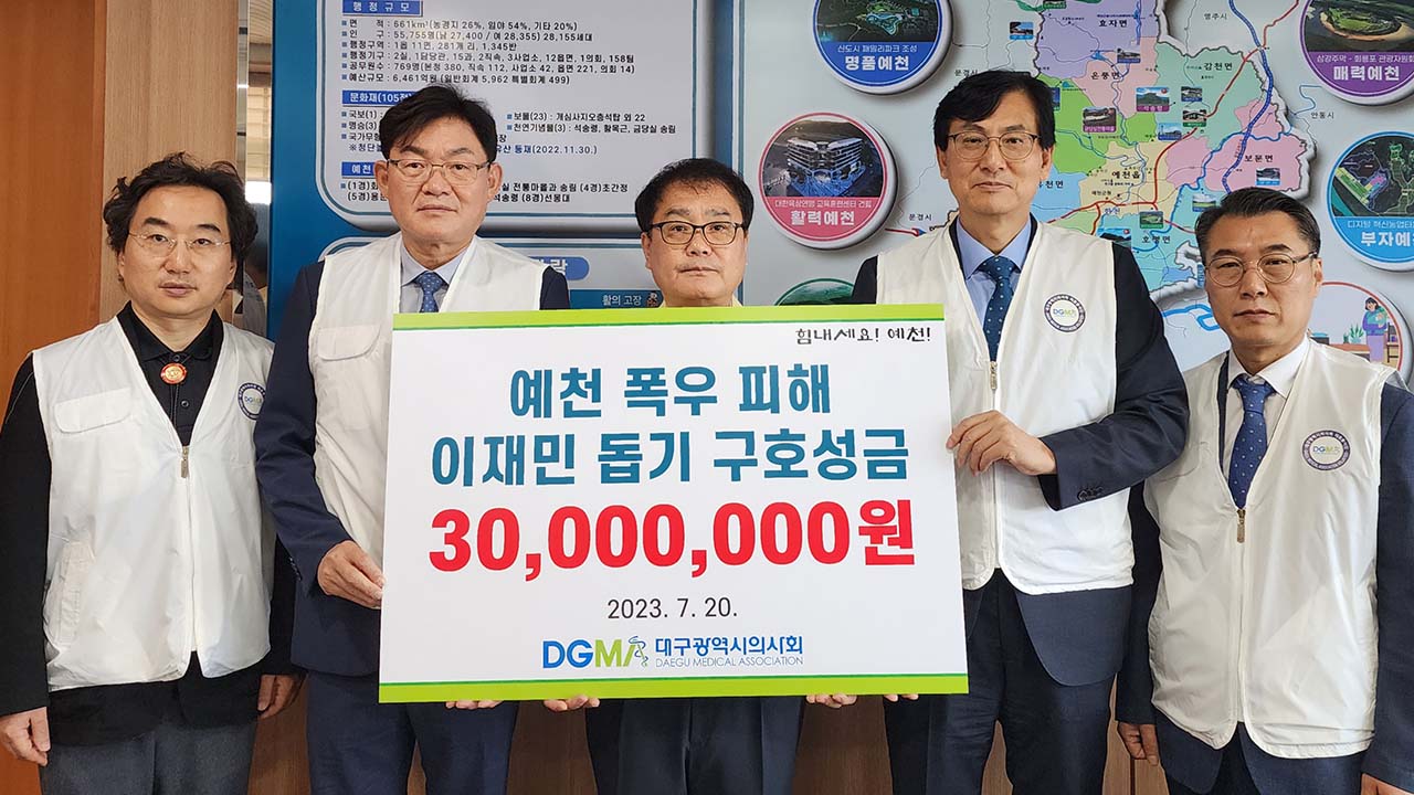 대구시의사회는 집중호우 피해를 본 예천군을 찾아 이재민 돕기 성금 3,000만 원을 전달했습니다.대구시의사회는 7월 18일 이사회를 열고 이번 집중호우로 특히 피해가 큰 지역에 도움을 줄 것을 의결하고 7월 20일 예천군을 찾아 성금을 전달했습니다. 또 제2작전사령부를 찾아 폭우 피해 복구 작업을 하고 있는 군 장병들...