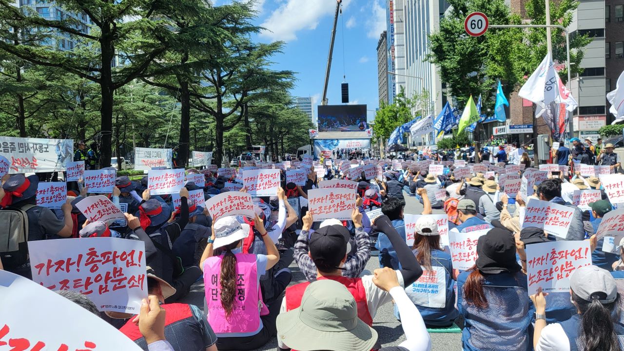 민주노총 대구·경북 본부는 윤석열 정권의 퇴진을 요구하며 7월 5일 국민의힘 대구시당 앞에서 주최 측 추산 천여 명이 참석한 가운데 총파업 승리 결의대회를 열었습니다."지난 1년간 민주주의는 수십 년 전으로 후퇴했다"며 "건설노조 탄압은 양회동 열사를 죽음으로 내몰고, 일은 죽을 만큼 위험하게 오랫동안 시키고 월...