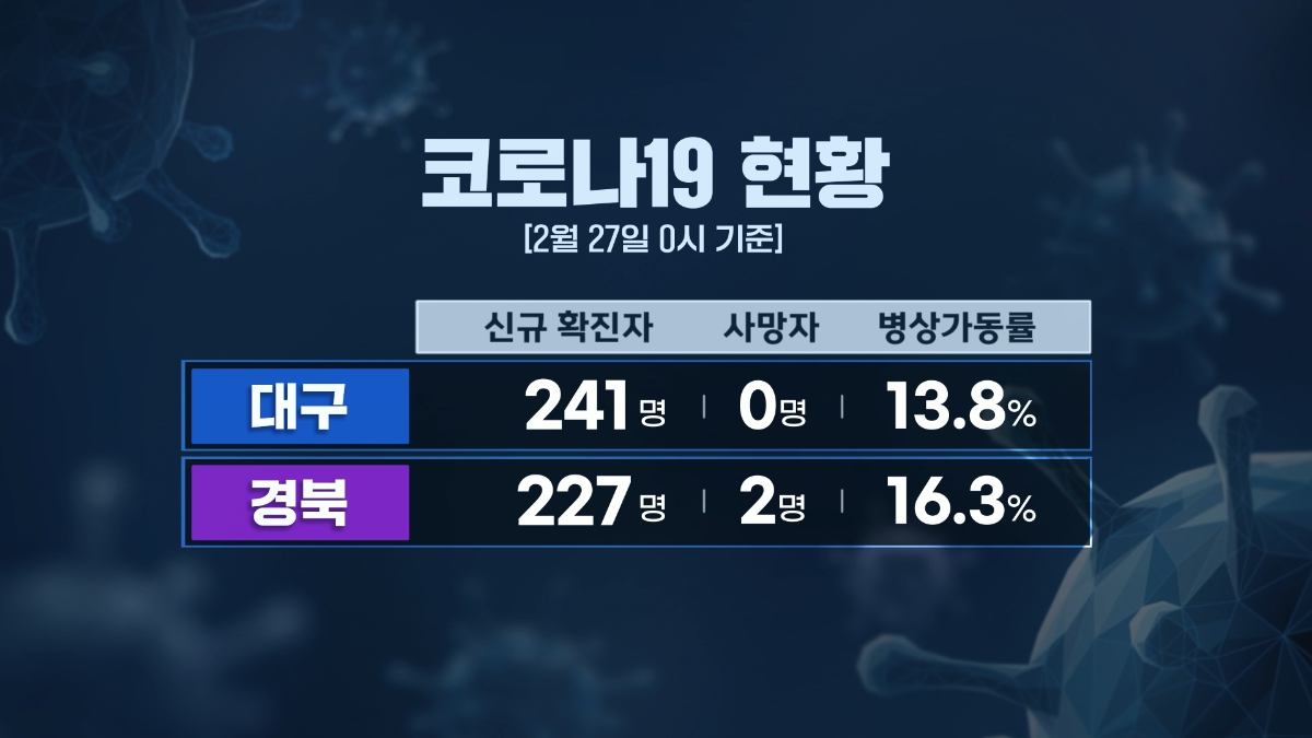 코로나 19 신규 확진자가 지난주와 비슷하게 나왔습니다.2월 27일 0시 기준 코로나 19 신규 확진자는 대구 241명, 경북 227명으로, 지난주 같은 요일에 비해 대구는 15명 늘었고, 경북은 14명 줄었습니다.사망자는 경북에서 2명 나왔습니다. 코로나 19 전담 치료 병상 가동률은 대구 13.8%, 경북 16.3%입니다.집에서 격리 ...