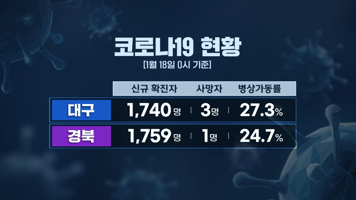 코로나 19 확진자의 감소세가 이어졌습니다.1월 18일 0시 기준 코로나19 신규 확진자는 대구 1,740명, 경북 1,759명으로, 지난주 같은 요일에 비해 대구는 637명, 경북은 804명 줄었습니다.사망자는 대구에서 3명, 경북에서 1명 나왔습니다.코로나 19 전담 치료 병상 가동률은 대구 27.3%, 경북 24.7%입니다.집에서 격리 치...