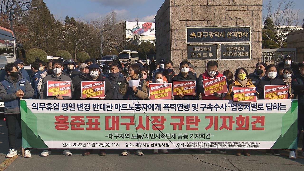 대형마트 의무휴업일 변경을 두고 대구시와 노동단체 갈등이 커지고 있습니다.민주노총과 인권운동연대, 정의당 대구시당 등 17개 단체는 기자회견을 열고 "대구시가 대형마트 의무휴업일 평일 변경 논의에 이해당사자인 마트 노동자와 소상공인이 배제된데 항의하는 노동자들을 탄압하고 있다"고 비판했습니다.앞서 12월 1...