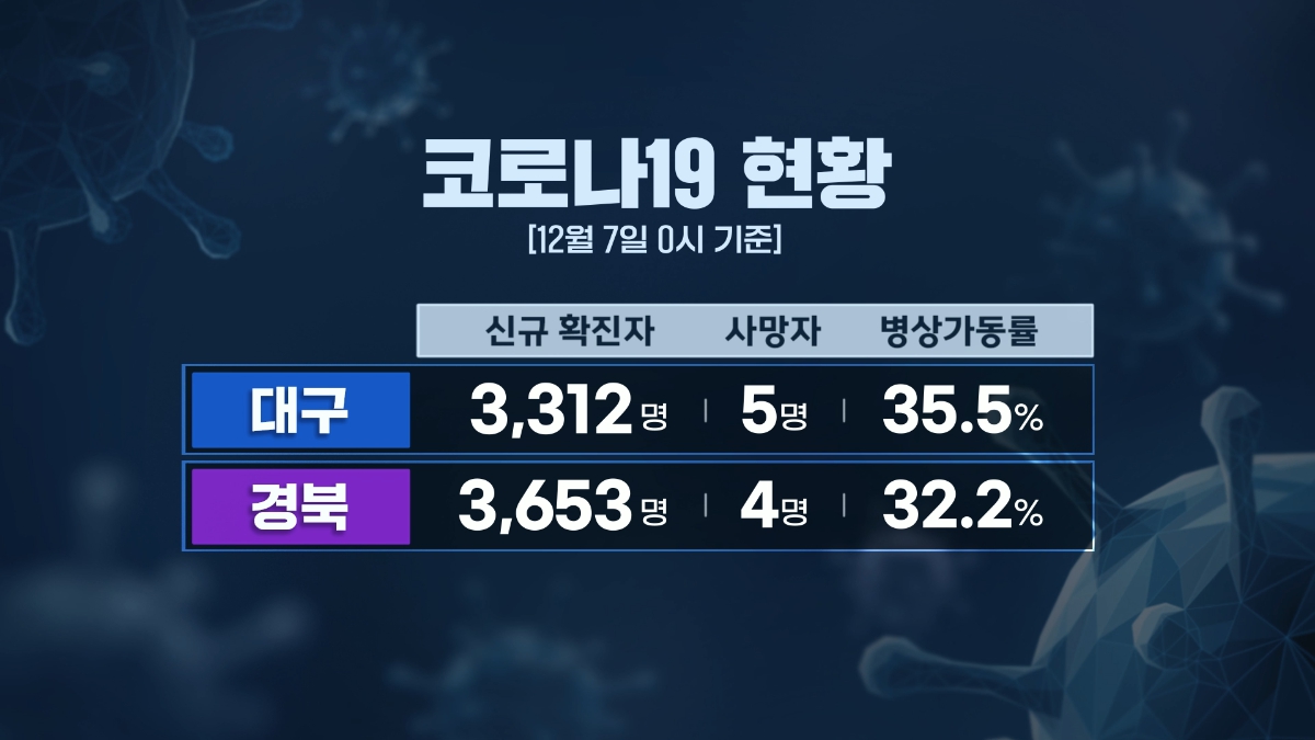 코로나 19 확진자가 대구는 늘고, 경북은 소폭 줄었습니다.12월 7일 0시 기준 코로나 19 신규 확진자는 대구 3,312명, 경북 3,653명으로, 지난주 같은 요일에 비해 대구는 286명 늘고, 경북은 29명 줄었습니다.사망자는 대구에서 5명, 경북에서 4명 나왔습니다.코로나 19 전담 치료 병상 가동률은 대구 35.5%, 경북 32.2%입...