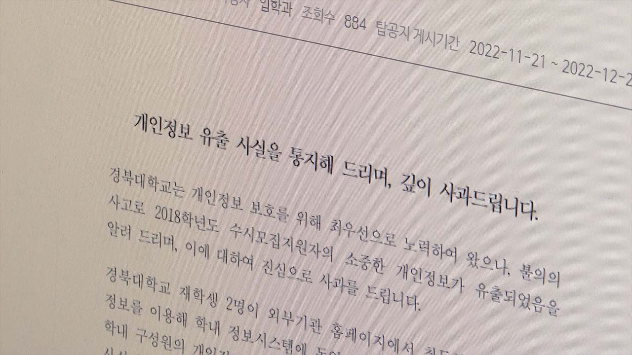 ◀앵커▶경북대학교 구성원들의 개인정보를 재학생 2명이 무더기로 유출됐다는 보도, 얼마 전 있었는데요. 개인 정보는 학교 구성원뿐 아니라 과거 대학 입시에 지원했던 수험생까지 대거 포함된 것으로 확인됐습니다.취재기자와 관련 소식 살펴보겠습니다. 조재한 기자 우선 처음 상황부터 짚어보죠. 맨 처음 알려진 게 지난...