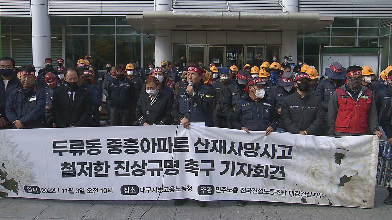 ◀앵커▶2021년 전국의 건설 현장에서 목숨을 잃은 노동자는 417명이었습니다.대부분 안전조치 미흡 때문입니다.사고를 막자며 중대재해처벌법까지 도입했지만, 지금까지 단 한 명도 처벌받지 않았습니다.대구에서도 지난주 건설노동자 한 명이 목숨을 잃었는데, 건설사 측과 책임 공방이 일면서 아직 장례조차 치르지 못하고...