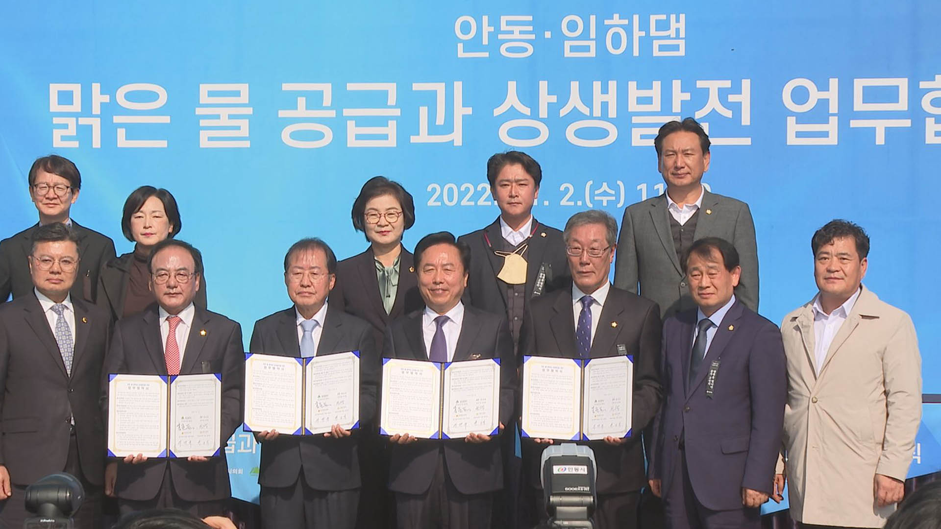 ◀앵커▶대구 시민이 안동·임하댐 물을 식수로 사용하는 내용의 협약을 오늘 대구시와 안동시가 체결했습니다.1조 4천억 원이 들 걸로 보이는 대규모 사업은 전액 국비로 해야 해서 추진할지 말지는 앞으로 환경부가 결정해야 합니다.취재기자가 나와 있습니다. 권윤수 기자, 구미 해평취수장 물을 쓰기로 협약한 지 1년도 채...
