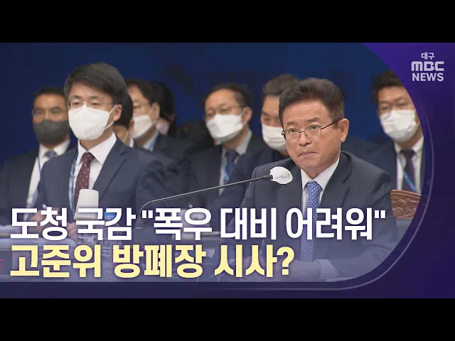 ◀앵커▶경북도청에 대한 국회 행정안전위원회의 국정감사가 있었습니다.태풍 힌남노 피해 복구 문제와 원자력발전소의 안전 문제, 고준위 방폐장 추진 등에 대한 질의가 이어졌는데, 이철우 지사 답변 한 번 들어보시죠.장미쁨 기자가 보도합니다.◀기자▶심각한 인명 피해가 발생한 포항 힌남노 피해 복구 문제가 국정 감사에...