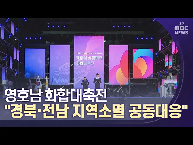 ◀앵커▶경북과 전남의 문화 교류 축제인 영호남 상생협력 화합 대축전이 경북도청에서 열렸습니다.두 지역 도지사와 정치권도 안동에서 만나 국립 공공의대 설립 등 지역 소멸 위기 극복을 위한 정책적 대응에 적극 협력하기로 약속했습니다.김서현 기자입니다. ◀기자▶전라남도 영광의 굴비부터 경상북도 상주에서 키운 사과...