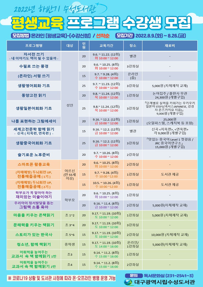 대구의 9개 공공도서관이 2학기에 개강하는 120개 독서문화강좌에 참여할 수강생을 모집합니다.2.28기념학생도서관은 초등학생 대상 '신나는 교과서 속 책 읽기'와 '한국사 읽기' 등 13개 강좌, 중앙도서관은 성인 대상 '기초 여행 영어·중국어·일본어 회화', 스마트폰 활용 기초 등 10개 강좌를 엽니다.남부도서관은 성인 ...