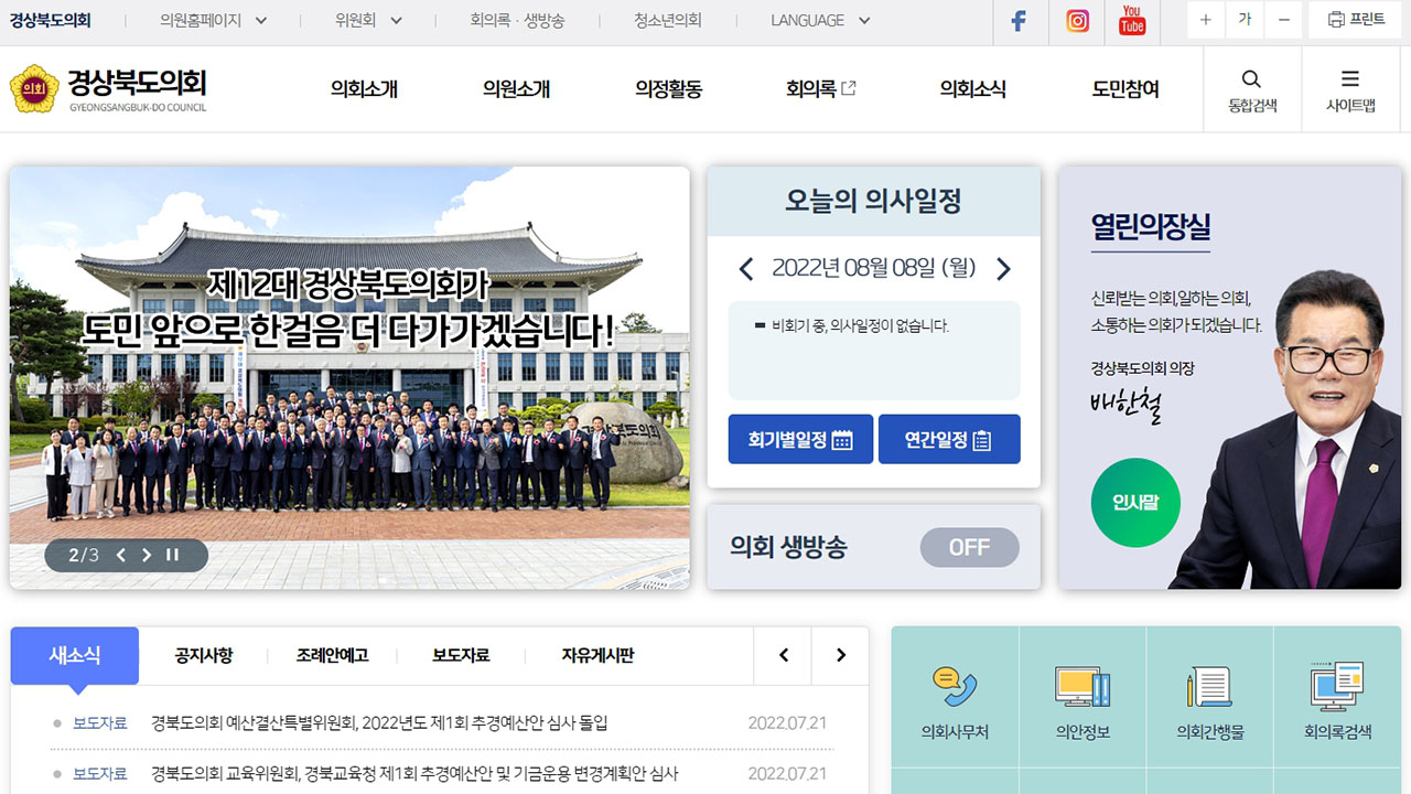 경상북도의회가 홈페이지를 새로 단장했습니다. 경상북도의회는 이용자들이 필요로 하는 정보를 쉽게 찾을 수 있도록 디자인과 메뉴를 재구성하고, 의원 정보와 자주 찾는 메뉴는 첫 화면에 배치했다고 밝혔습니다.홈페이지에 있는 문서를 다운로드 없이 열람할 수 있도록 했고, SNS와의 연계를 통해 다양한 의정 소식을 전...