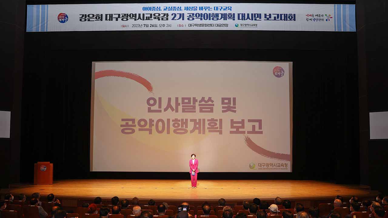 ◀앵커▶강은희 대구시 교육감이 선거 공약을 구체화해 앞으로 4년 동안 추진하겠다며 대시민 보고대회를 열었습니다.마음 교육을 강화하고 기업가 정신도 키우겠다 5대 공약 26개 정책 과제, 65개 실천 과제를 확정해 발표했습니다.선거 이후 교육 공동체 의견을 수렴한 것이라고 밝혔는데 시대 흐름과 맞지 않다는 지적도 ...