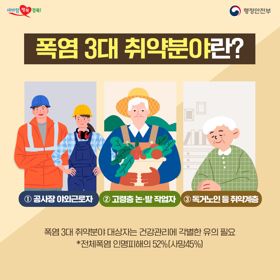경상북도가 폭염에 따른 인명과 재산 피해 최소화를 위해 본격적인 대응에 나섰습니다.경상북도는 물, 그늘, 휴식 같은 열사병 예방 3대 이행 수칙과 응급조치 방법을 야외 건설 현장에 안내하고, 고용노동부와 함께 폭염 취약성 판단 자가진단표도 나눠주기로 했습니다.오전 10시부터 정오, 오후 2시부터 4시 사이에는 현...