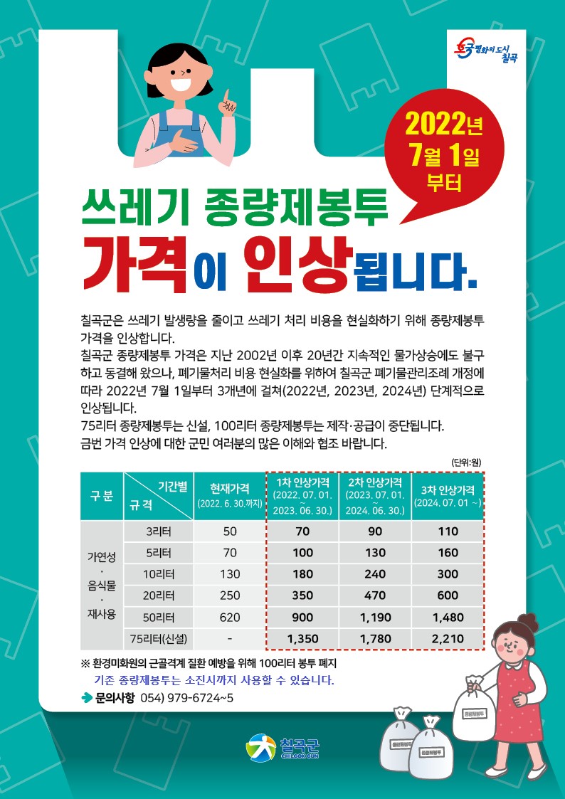 칠곡군, 쓰레기 종량제 봉투 가격 단계적 인상