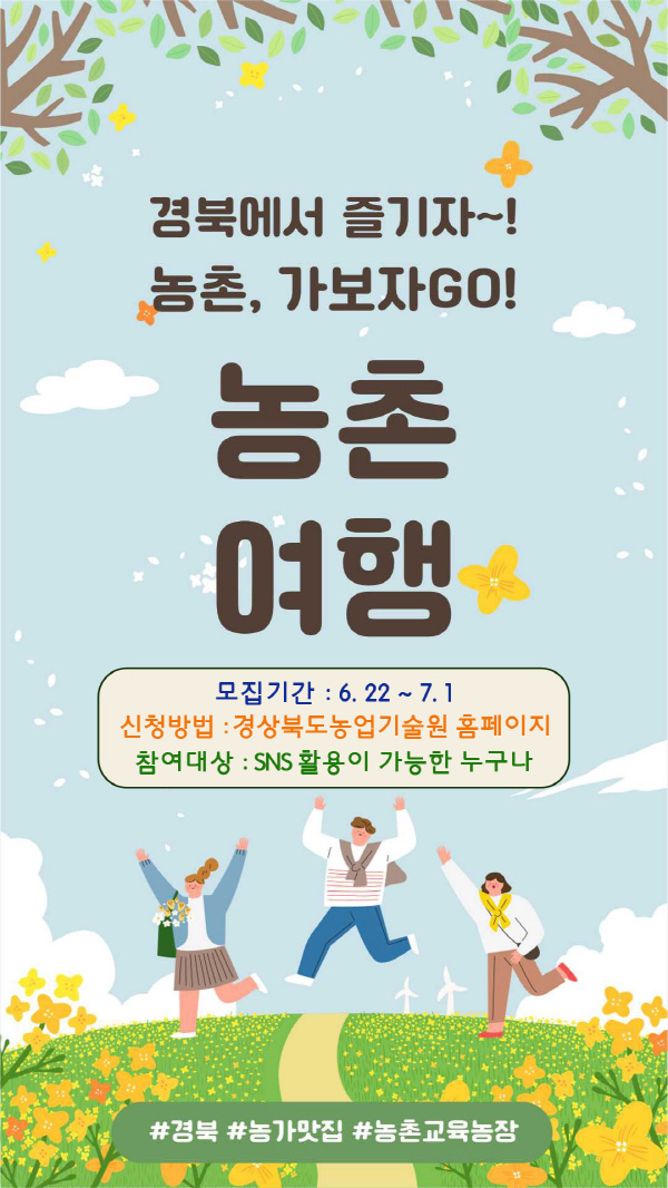 경북농업기술원이 산애들애 맛길여행 홍보 체험단을 선착순 모집합니다.산애들애 맛길여행은 농가 맛집, 농촌 교육농장, 농촌 관광자원을 연계해 농촌여행을 할 수 있는 프로그램으로 주요 코스로는 김천 육감만족길, 성주 태교누리길 등이 있습니다.체험단은 프로그램을 경험하고 후기를 블로그나 SNS 계정에 올려 농가 홍...