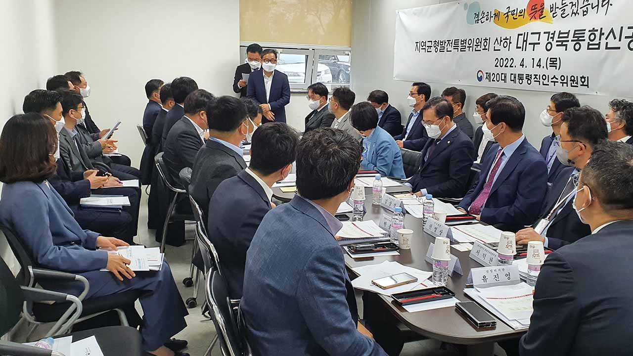대통령직 인수위원회는 홍석준, 이인선 인수위원과 대구·경북이 추천한 전문가 4명으로 통합 신공항 TF를 구성해 4월 14일 첫 간담회를 열었습니다.대구시와 경상북도는 군 공항 이전과 지원에 관한 특별법을 개정해 통합 신공항 건설에 국비를 지원하고, 남은 터 개발 사업에 국비 지원과 공공기관의 참여를 건의했습니다....
